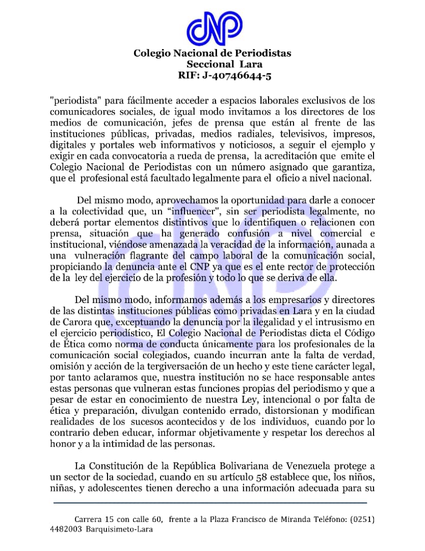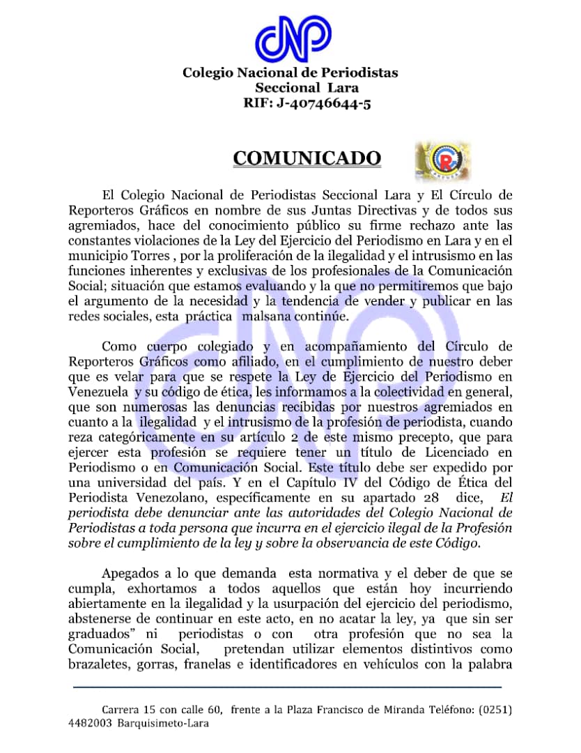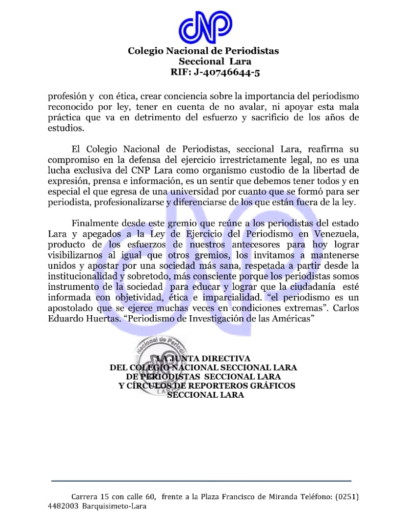 «El CNP Lara recuerda a los empresarios y directores de instituciones públicas y privadas, medios de comunicación sociales, como radio, televisión y medios digitales que el Código de Ética se aplica únicamente a los periodistas colegiados».