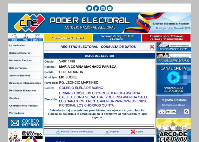 En la página oficial del Poder Electoral aparece reflejada la prohibición de Machado para ejercer cualquier cargo o funciones públicas por 15 años.
